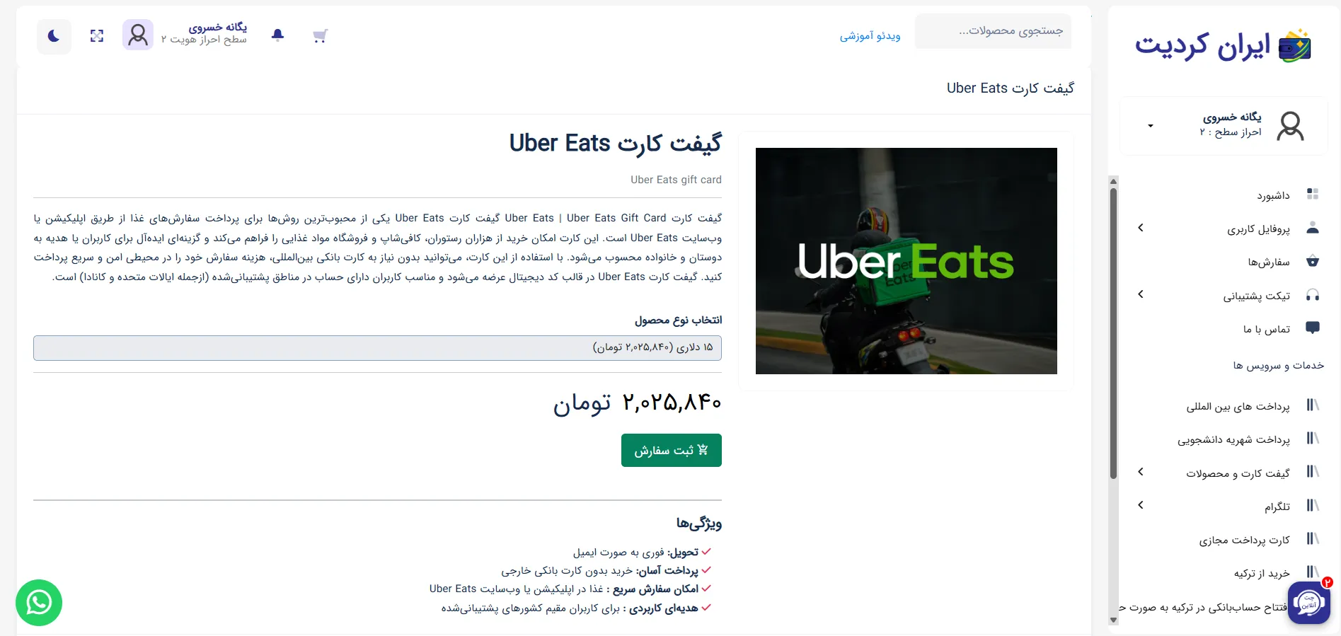 ۱) به بخش «گیفتکارت و محصولات» در ایران کردیت بروید و «گیفتکارت اوبر ایتس» را انتخاب کنید.